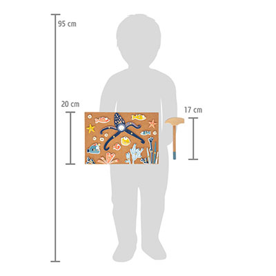 Dimension : plaque de liège env. 30 x 21 x 1 cm, marteau env. 17 x 7,5 x 2,5 cm