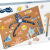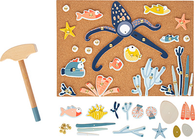 - Equipé d’une planche en liège, 1 marteau en bois, des clous décoratifs et des différents éléments.
