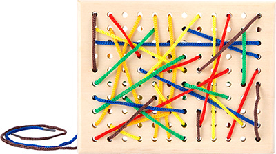 - Des fils de toutes les couleurs s’enfilent dans cette planche à trous.